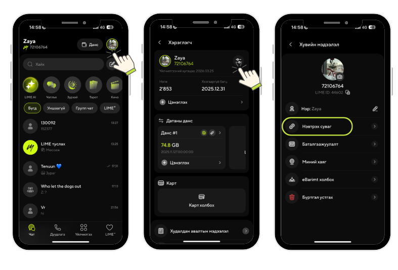 "Нэвтрэх суваг" хэсэгт дарж Google хаяг, Facebook хаяг болон Apple хаягаа холбон дараагийн удаа нэвтрэхдээ холбосон сошиал хаягаа ашиглан LIME апп-даа нэвтрэх боломжтой.