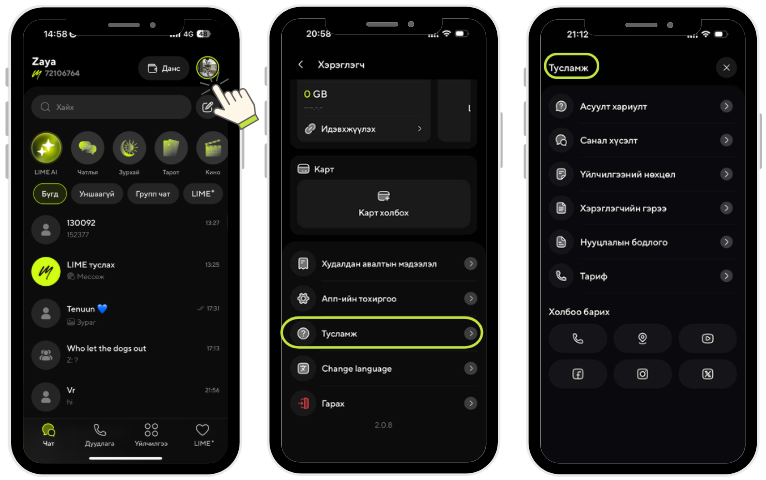 3. "Тусламж" цэснээс та санал хүсэлт илгээх, үйлчилгээний нөхцөл, хэрэглэгчийн гэрээ, нууцлалын бодлоготой танилцах, дуудлага, мессежний тариф харах болон LIME туслах ажилтантай холбогдох боломжтой.