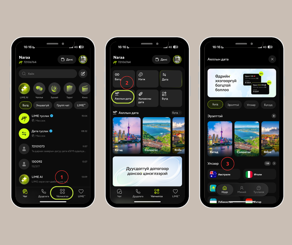 Аяллын дата авах заавар 1️⃣ Апп-ын баруун доод буланд байрлах Үйлчилгээ цэс дээр дарна. 2️⃣ Аяллын дата товчийг сонгоно. 3️⃣ Аялах улсаа сонгоод дата багцаас худалдан аваарай. Та хүссэн мэдээллээ авч чадсан уу?ТиймҮгүй