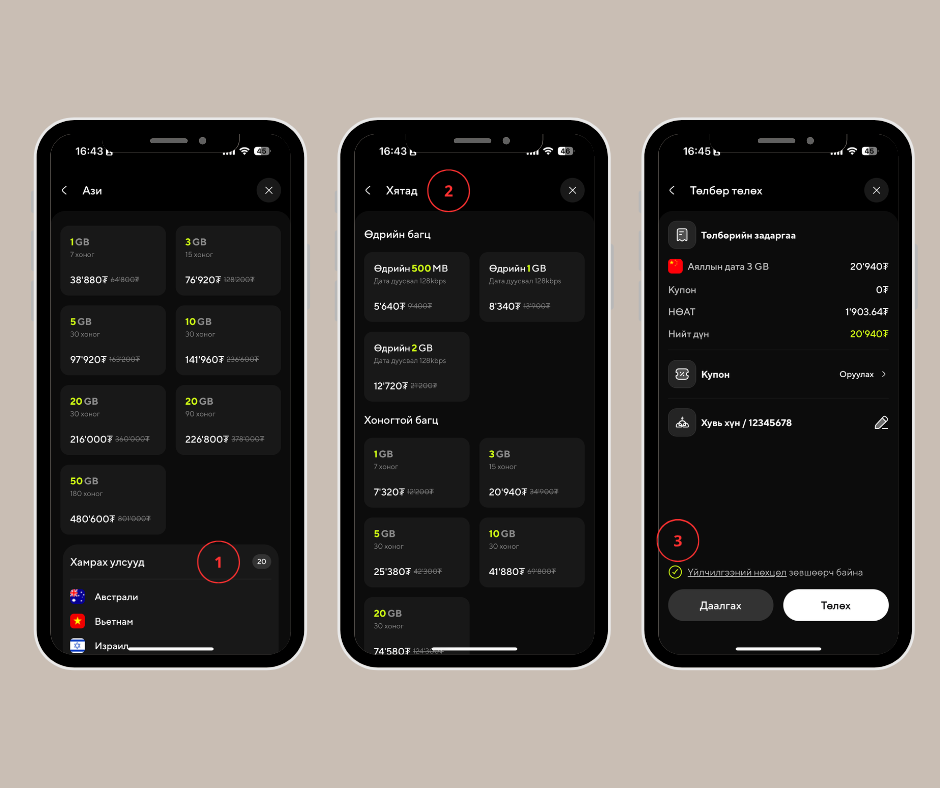 - 3️⃣ Дата багц сонгосны дараа Төлбөр төлөх үнийн дүнтэй танилцаж, Үйлчилгээний нөхцөл зөвшөөрснөөр Төлөх товчийг дарна.