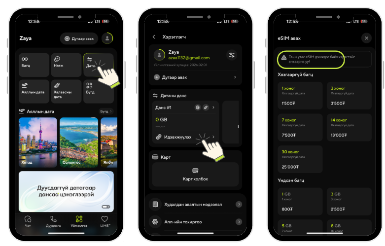 Халаасны дата төхөөрөмжийг ашиглахын тулд эхлээд дата eSIM худалдан авч гар утсандаа суулгаарай. Хэрвээ идэвхжүүлсэн датаны данстай бол дахин eSIM худалдан авах шаардлагагүй. Нэг данснаас дата болон халаасны дата төхөөрөмжөө ашиглах боломжтой.