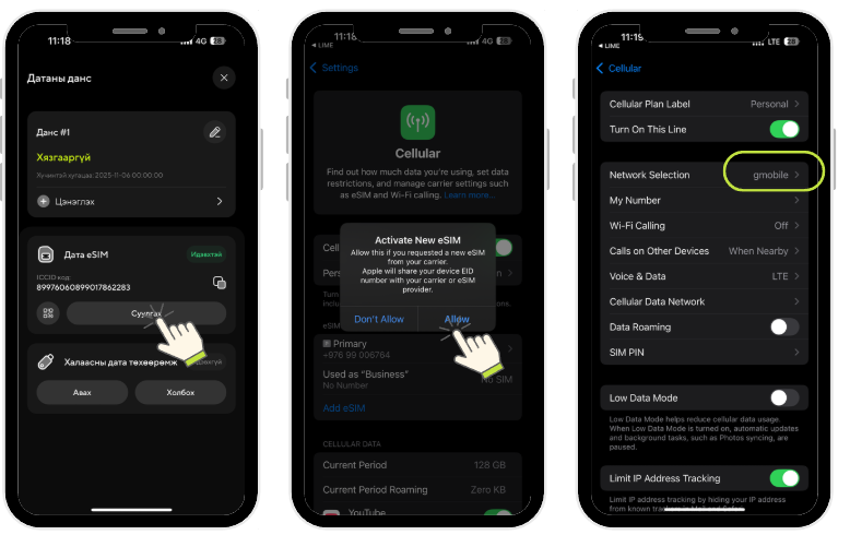 3, "eSIM" авах хэсэгт өөрийн гар утсыг eSIM дэмждэг эсэхийг шалган, дэмждэг бол eSIM-ээ худалдан авч төлбөрөө төлнө.